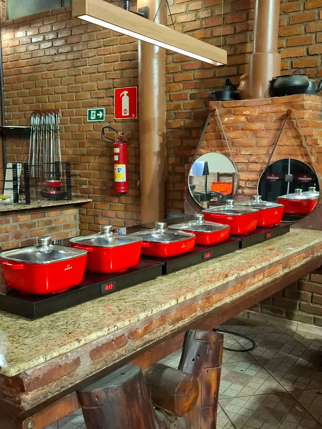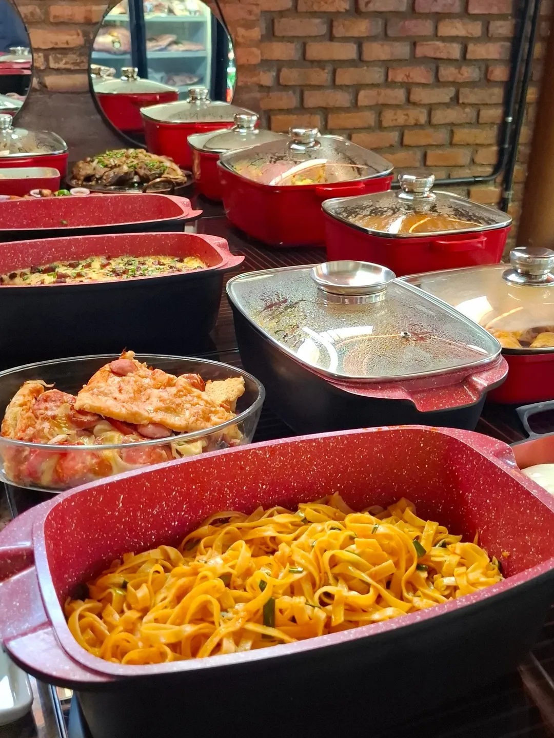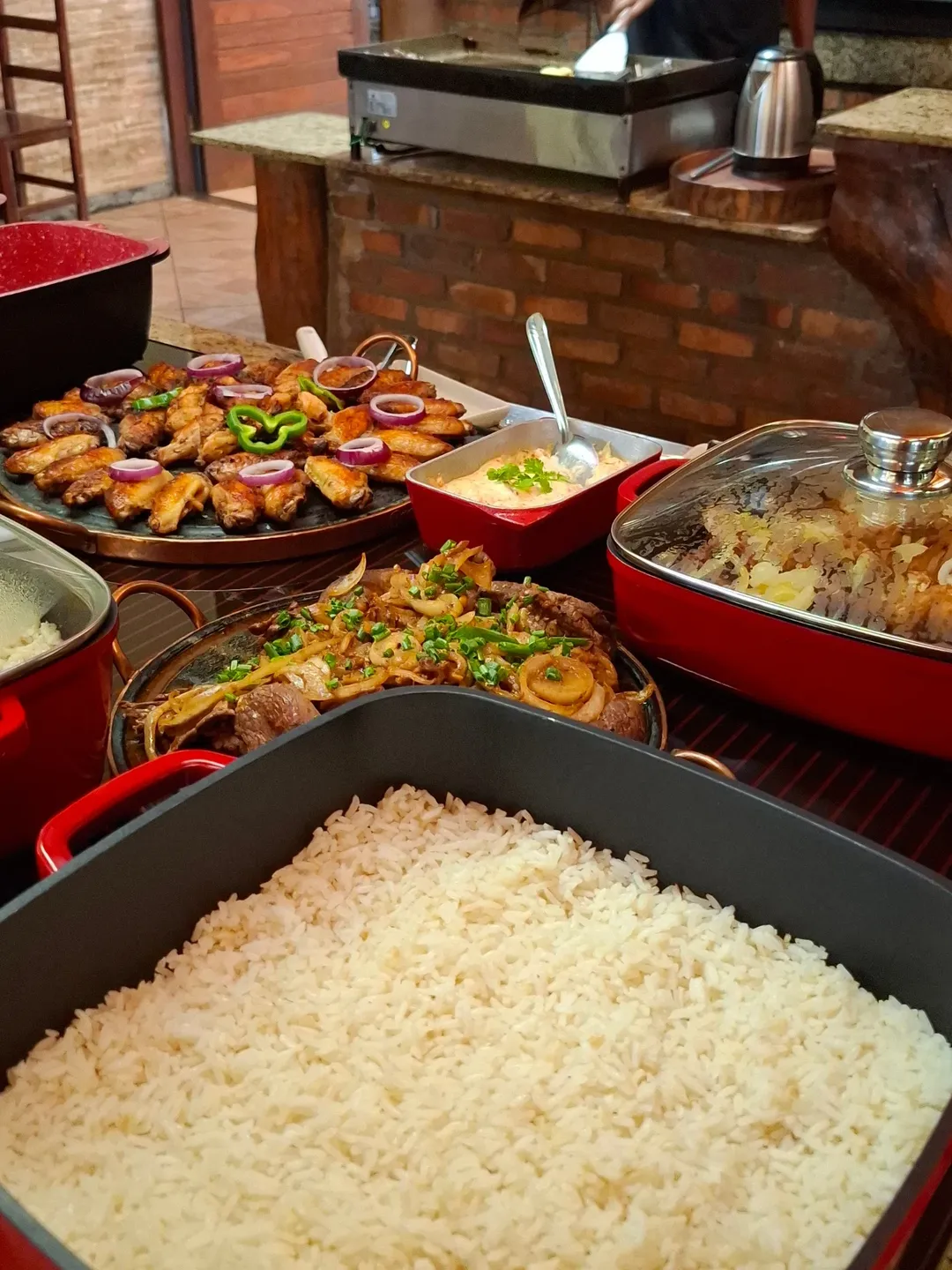 Panelas vermelhas no buffet
